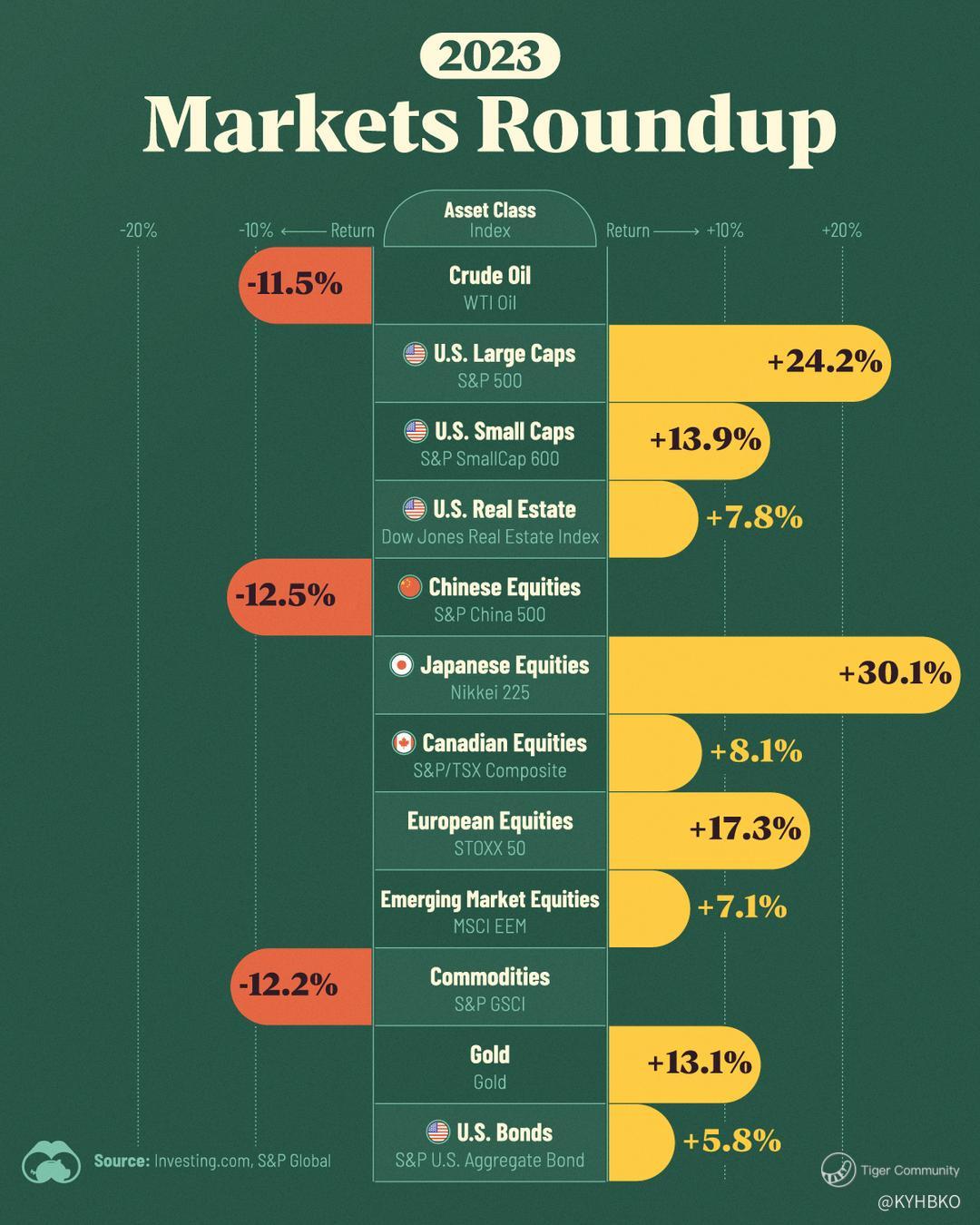 2023 markets roundup. What are the top-performing asset classes? All asset classes seem to do well except for Crude oil (down 11.5%), Chinese equities (down 12.5%), and commodities (down 12.2%).