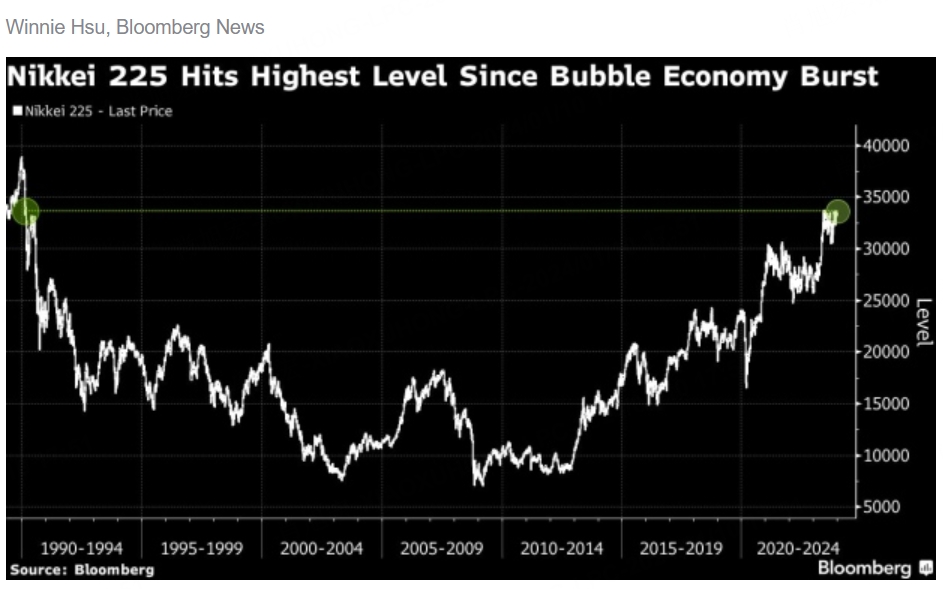 1.Japan stocks hit 34-year high, Japan’s Nikkei 225 Climbs Back to Highest Since 1990 Bubble Era.