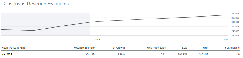 Consensus estimates have revenue projected to grow by almost 10% for Toyota's fiscal year ending March 2024 to $304.15 billion.