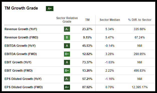 Toyota has delivered strong, profitable growth over the past year. The company's net income margin of 9.3% is more than 100% above the sector median. Toyota's crucial underlying metrics have resulted in high Seeking Alpha Sector Relative Growth Grades. Revenue, EBITDA, and EBIT have seen impressive growth year-over-year, and forward numbers are strong.