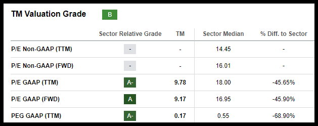 Toyota still appears inexpensive despite the price performance versus the sector. Both historical and forward price-to-earnings ratios are each almost 50% below the sector median, and the price/cash flow forward ratio of 5.93 is 40% below the sector median, according to Seeking Alpha's TM Valuation Grade data. The PEG metric, which measures value and growth, is a mere 0.17, almost 70% below the sector median.