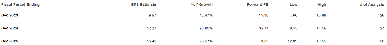 The long-term Forward P/E ratio is also important. The consensus estimate has EPS growing about 60% by 2025 and forward P/E falling to around 9.5.