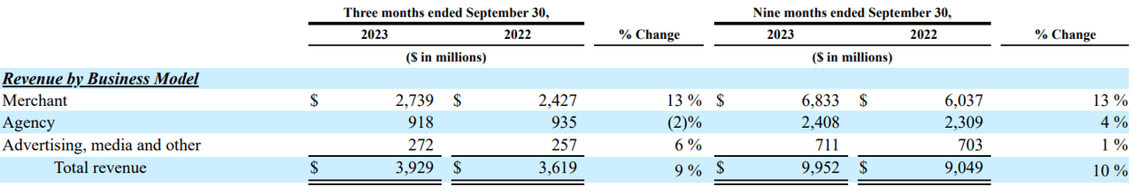 Booking is driven by wider profit and FCF margins, and one of the drivers behind the gap is that Expedia relies more heavily on the lower-margin merchant business model. In the merchant model, the customer pays the online travel agency (OTA), who then pays the service providers, thereby incurring additional expenses. In the agency model, the customer pays the service providers, and the OTA gets a commission. In Q3, roughly 70% of Expedia's revenue ($2.739 of $3.929B) derived from the merchant model. Booking, in contrast, only drew about 54% of revenue ($3.945B of $7.341B) via the merchant business model.