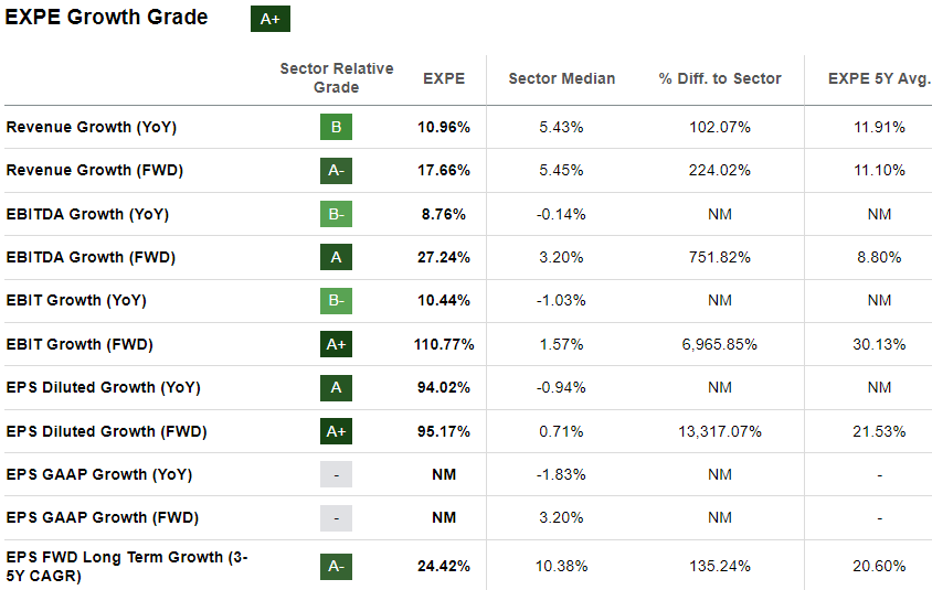 Expedia has secured an overall A+ Growth Grade with strong underlying forward sales and profit metrics. Revenue growth FWD is approximately 17%, EBITDA 27%, and EBIT 110%, all significantly above the sector median.