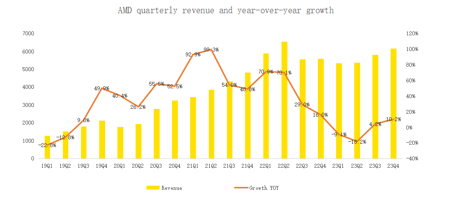Specifically, AMD's revenue was $6.168 billion in the fourth quarter, slightly exceeding analysts' expectations of $6.13 billion, an increase of 10.2% year-on-year, and an acceleration from 4.2% in the third quarter of last year: