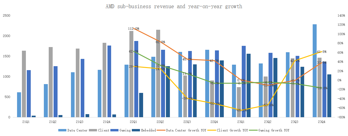 In the fourth quarter, AMD's revenue and profits are in line with expectations, but dragged down by PC, gaming, embedded segments, and poor guidance for the first quarter of 2024, causing investor concerns.