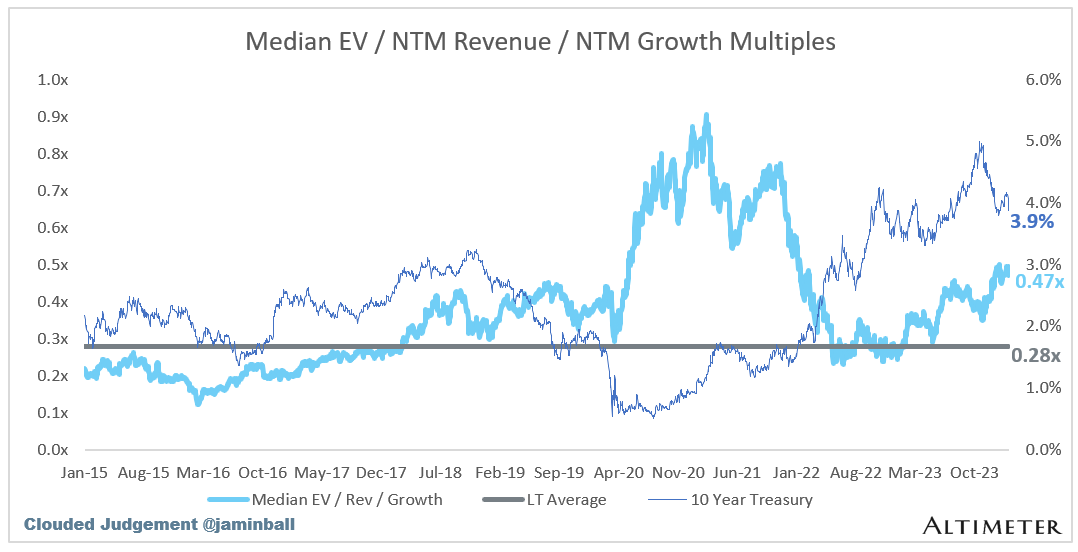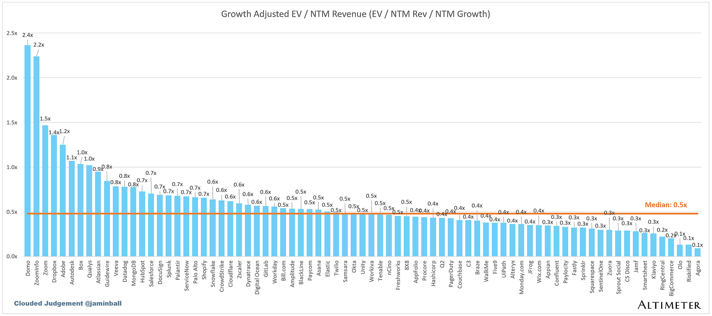 The below chart shows the EV / NTM revenue multiple divided by NTM consensus growth expectations. So a company trading at 20x NTM revenue that is projected to grow 100% would be trading at 0.2x. The goal of this graph is to show how relatively cheap / expensive each stock is relative to their growth expectations