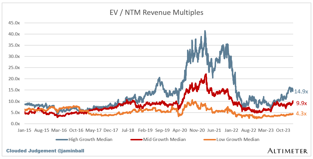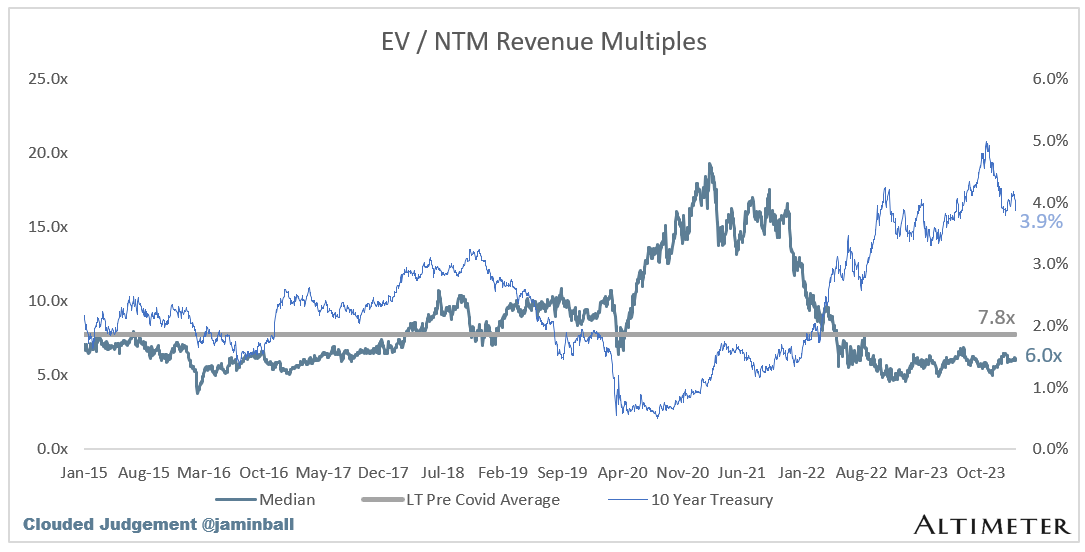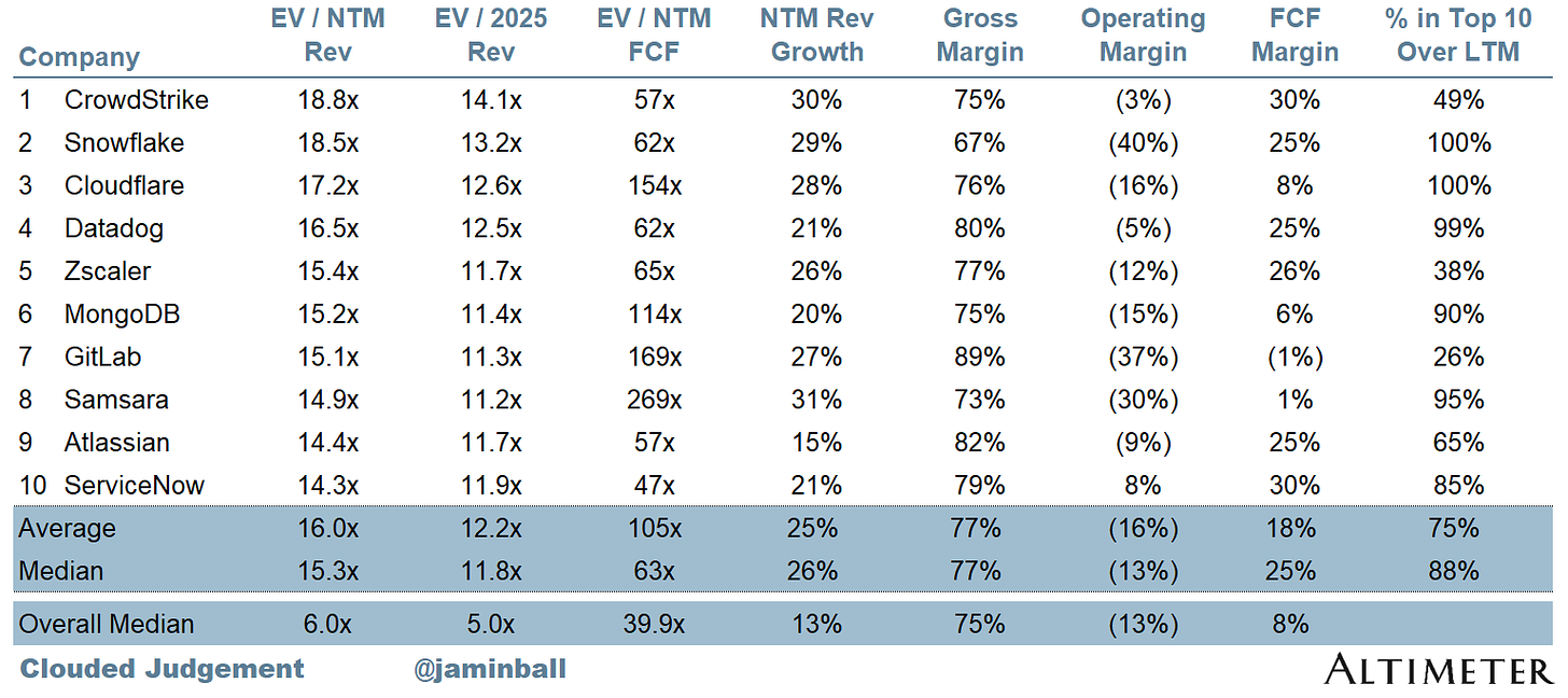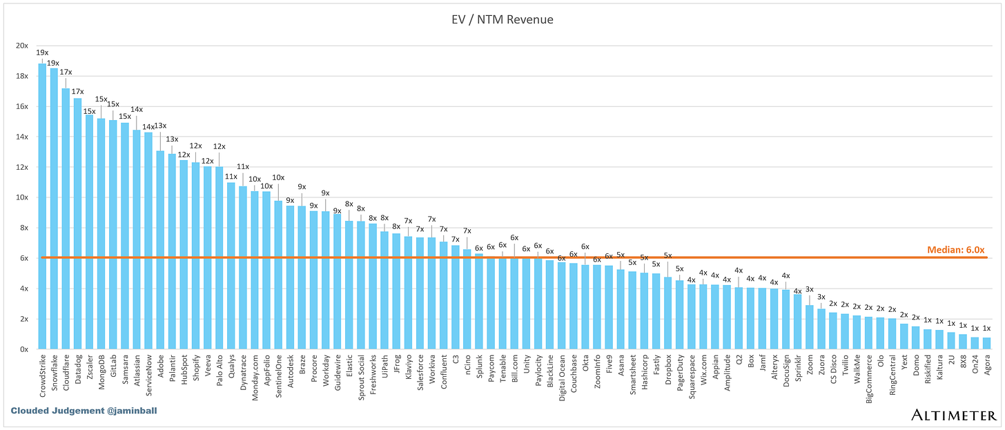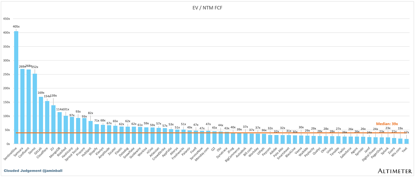 SaaS businesses are generally valued on a multiple of their revenue - in most cases the projected revenue for the next 12 months. Revenue multiples are a shorthand valuation framework. Given most software companies are not profitable, or not generating meaningful FCF, it’s the only metric to compare the entire industry against. Even a DCF is riddled with long term assumptions. The promise of SaaS is that growth in the early years leads to profits in the mature years. Multiples shown below are calculated by taking the Enterprise Value (market cap + debt - cash) / NTM revenue.