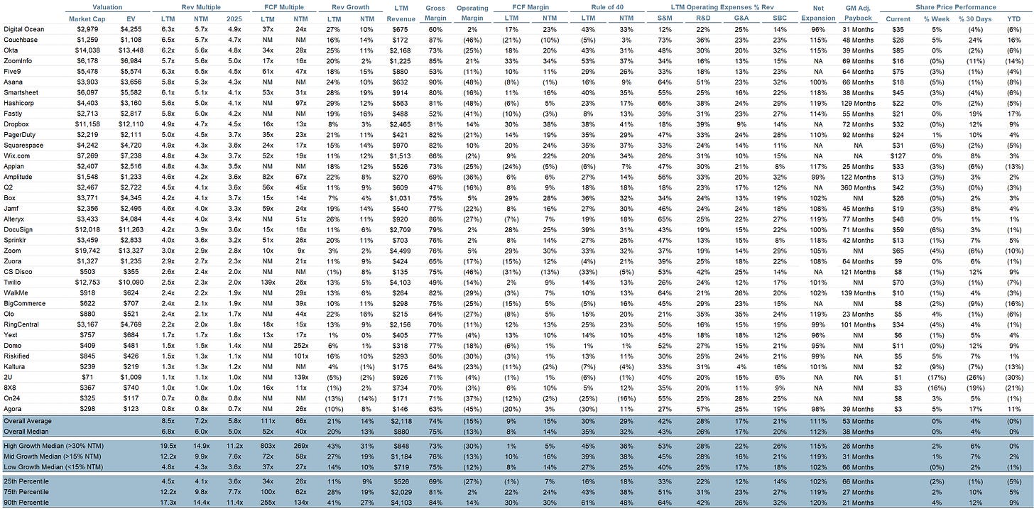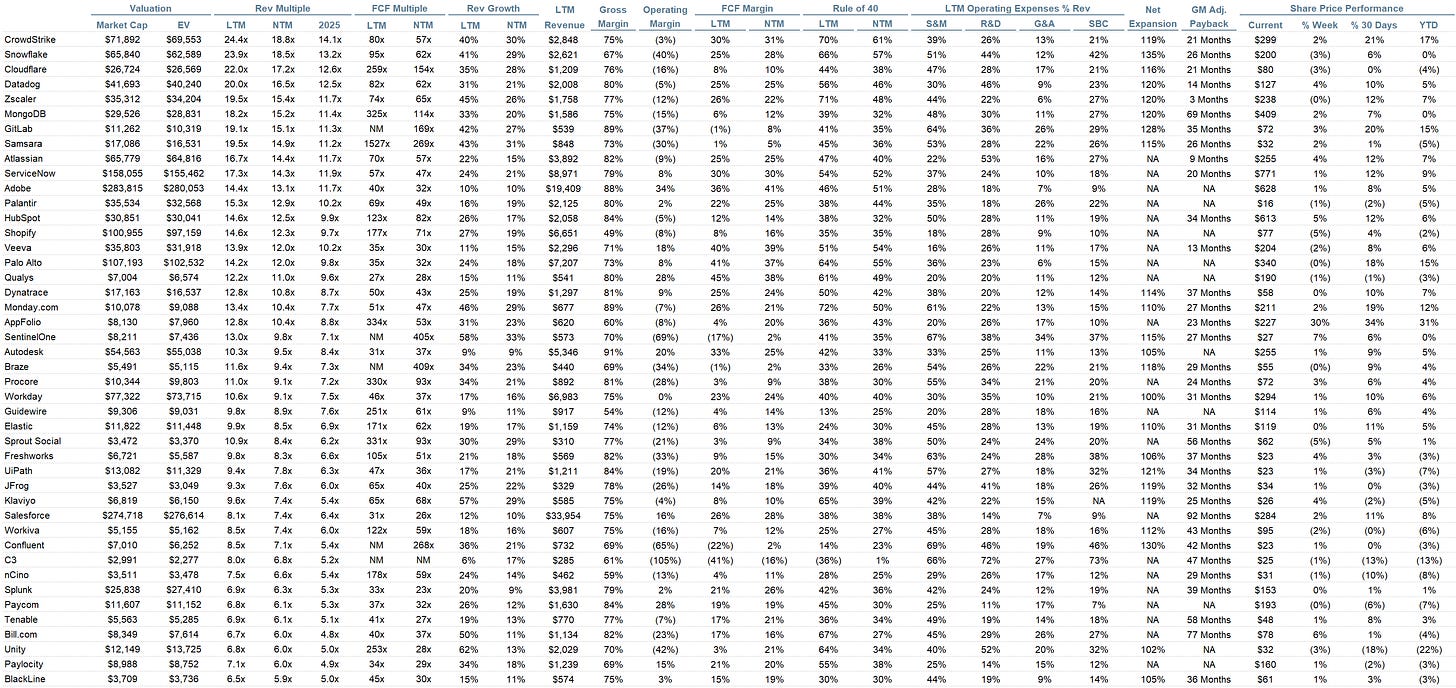 Rule of 40 shows rev growth + FCF margin (both LTM and NTM for growth + margins). FCF calculated as Cash Flow from Operations - Capital Expenditures
