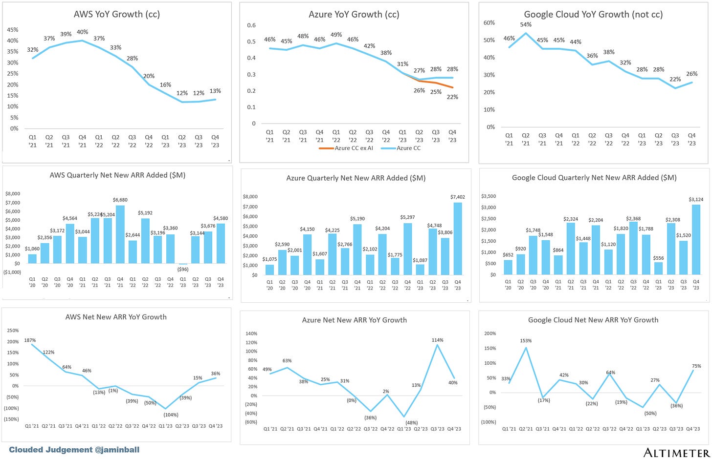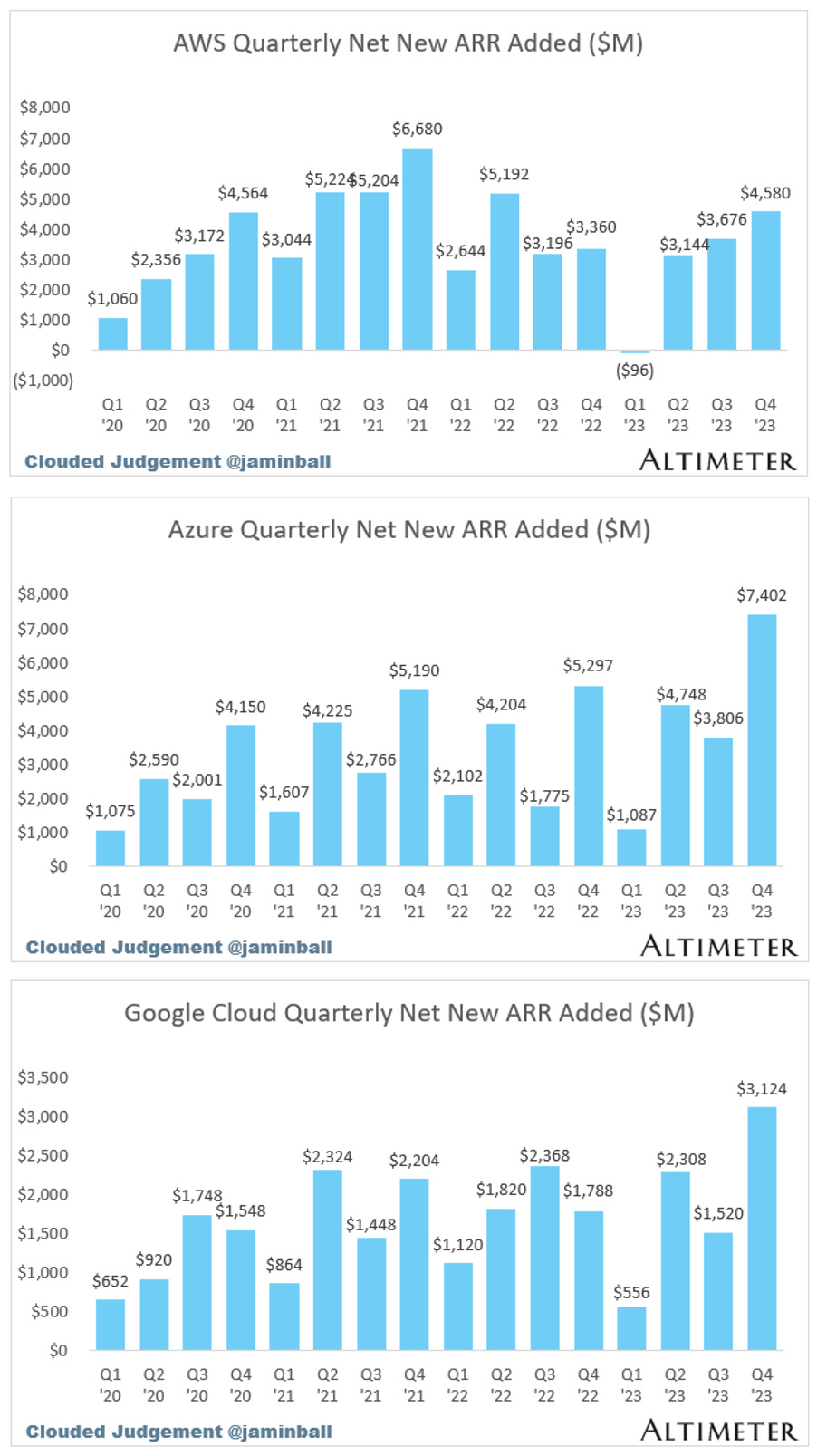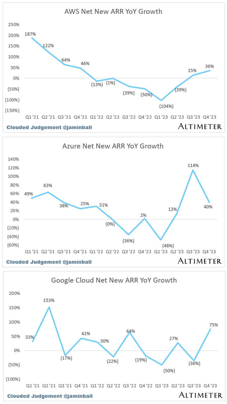 And the final set of charts show the YoY growth rate in quarterly net new ARR added. AWS has quite the recovery graphic