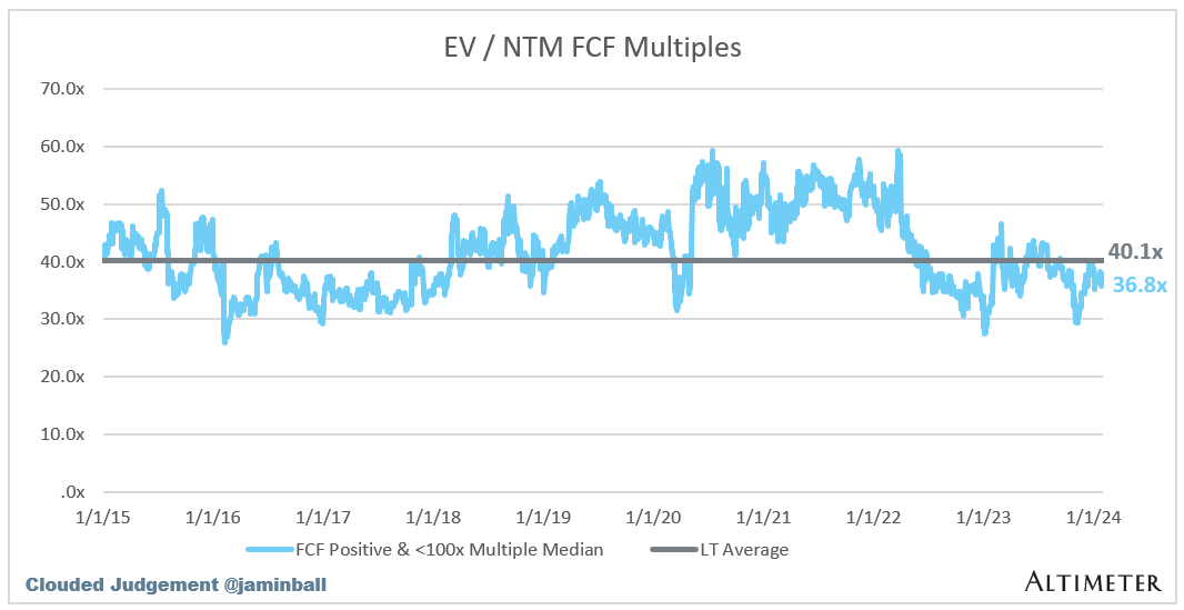 The line chart shows the median of all companies with a FCF multiple >0x and <100x. I created this subset to show companies where FCF is a relevant valuation metric.