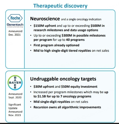 Apart from developing drugs themselves, Recursion also collaborates with other pharmaceutical companies to aid in drug discovery. For instance, in 2021, the company signed an agreement with Roche and its subsidiary Genentech, agreeing to collaborate on up to 40 projects in the fields of neurology and cancer. Roche has already paid a $150 million upfront, and Recursion could potentially receive billions more in milestone payments in the future!