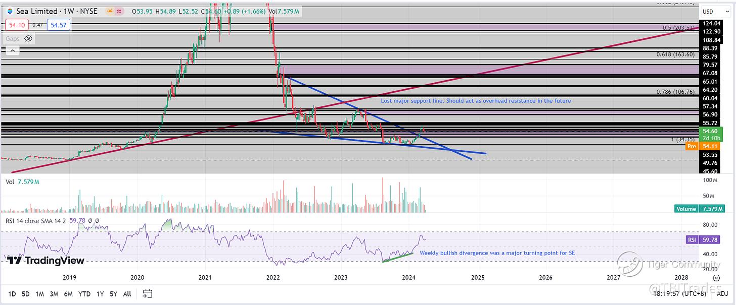 SE was a pandemic darling with bags of promise as the stock received upgrade after upgrade. However, as the world returned to normalcy, it fell out of favour with investors. The breaking point was the time it broke its long-term trendline in May’22, as it continued to trend lower, to as low as 35 a share.