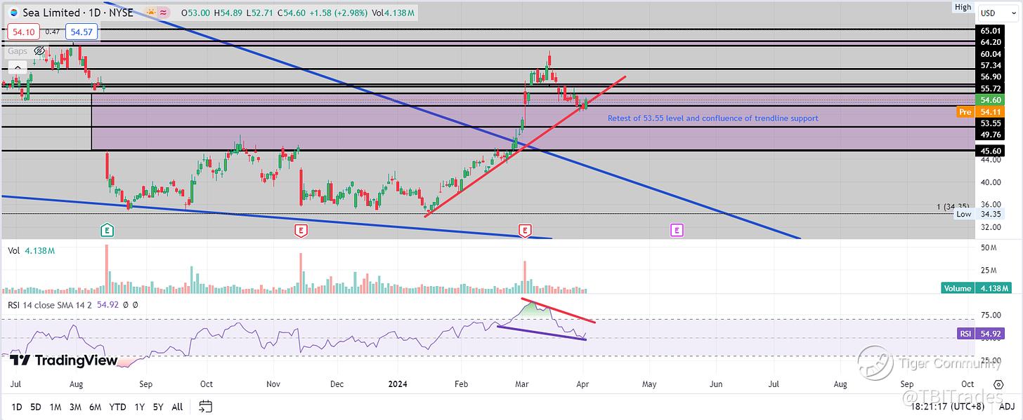 On the daily chart, we can see that bearish divergence marked a short-term top, as the stock pulled back into its trendline. It is now forming a hidden bullish divergence setup while retesting the 53.55 support. This was previously a level with significant basing, and thus it was not surprising to see it at this current level.