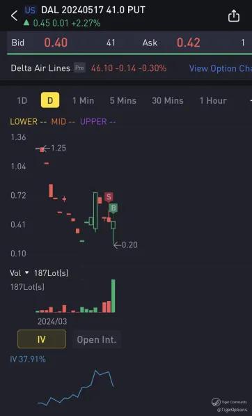 I successfully captured a profitable options play around Delta's recent earnings release. I sold $DAL 20240517 41.0 PUT$ a day prior to earnings release at 0.56 and buy back at the open at 0.37, gaining a modest 30%+ return. As you can see, the IV crush came after the earnings release. If I hold slightly longer, I could have sold at around 0.2 range even though the stock price was going down. For earnings trade in the future, I will be sure to wait around 20-30mins after open for the IV crush to happen before closing my trade.