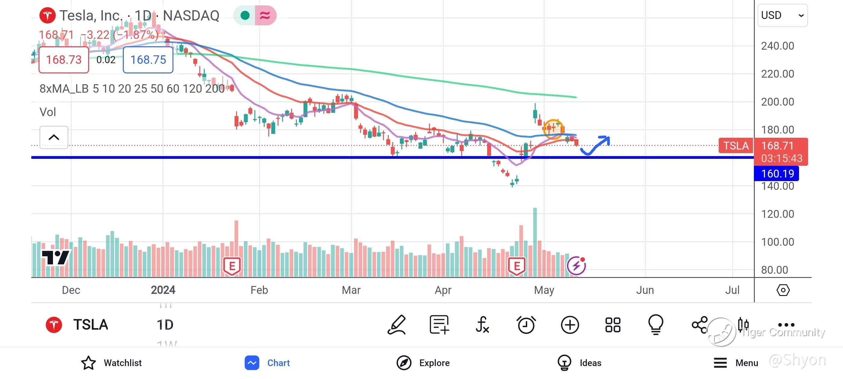 Tesla's stock price on May 11, 2024, is $168.47, below the support level of $170.4.