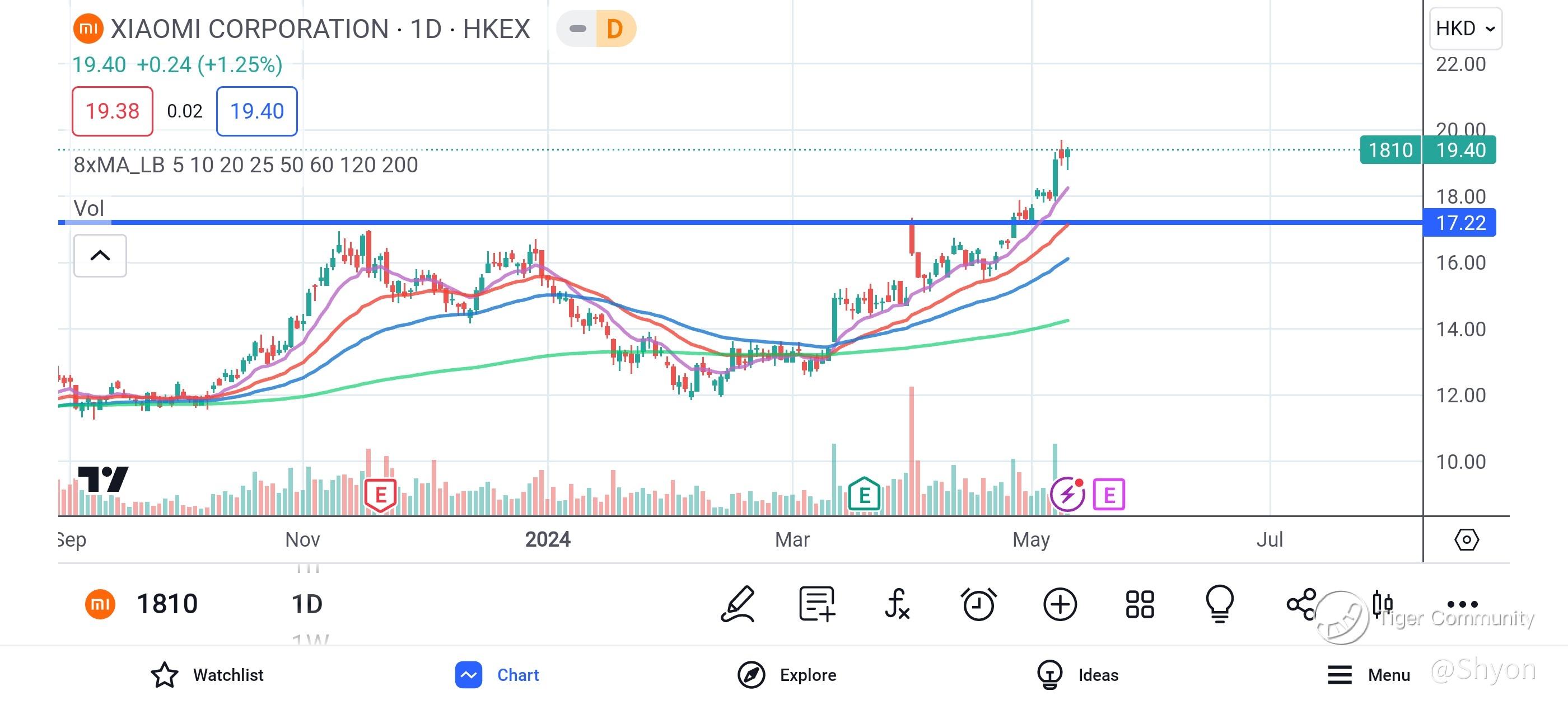 For Xiaomi, it has the strongest share price among the 3 stocks shared today. A clear uptrend with all the EMA facing upwards, one above each other. Moreover, we can see that the share price goes up slowly following the EMA10, which is an extreme bullish sign for the stock. If a pullback happens, 17.22 USD will be a great support level to take note. Anyway, with all the bullish signs, I believe$XIAOMI-W(01810)$