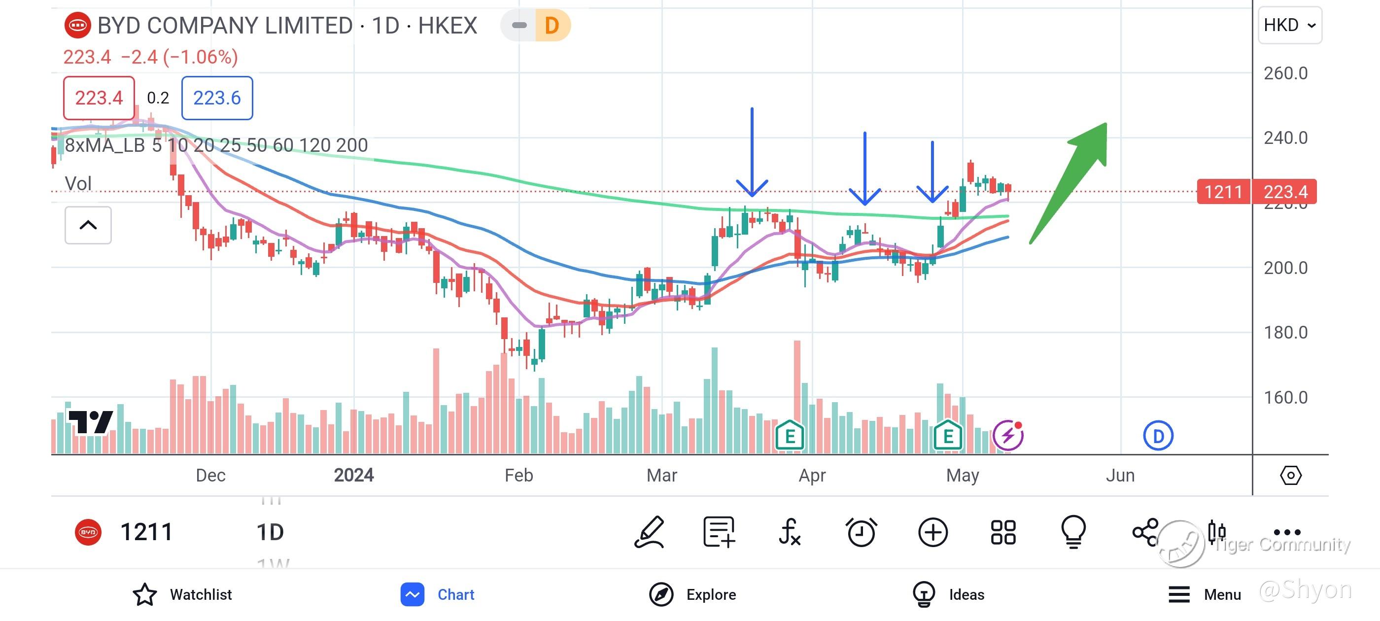 For BYD, the share price seems to be stable down after breaking out from its EMA200 trendline resistance. Next week, we should see EMA25 gold crosses over EMA200 as well. All the indicators show that the share price is bullish $BYD COMPANY(01211)$