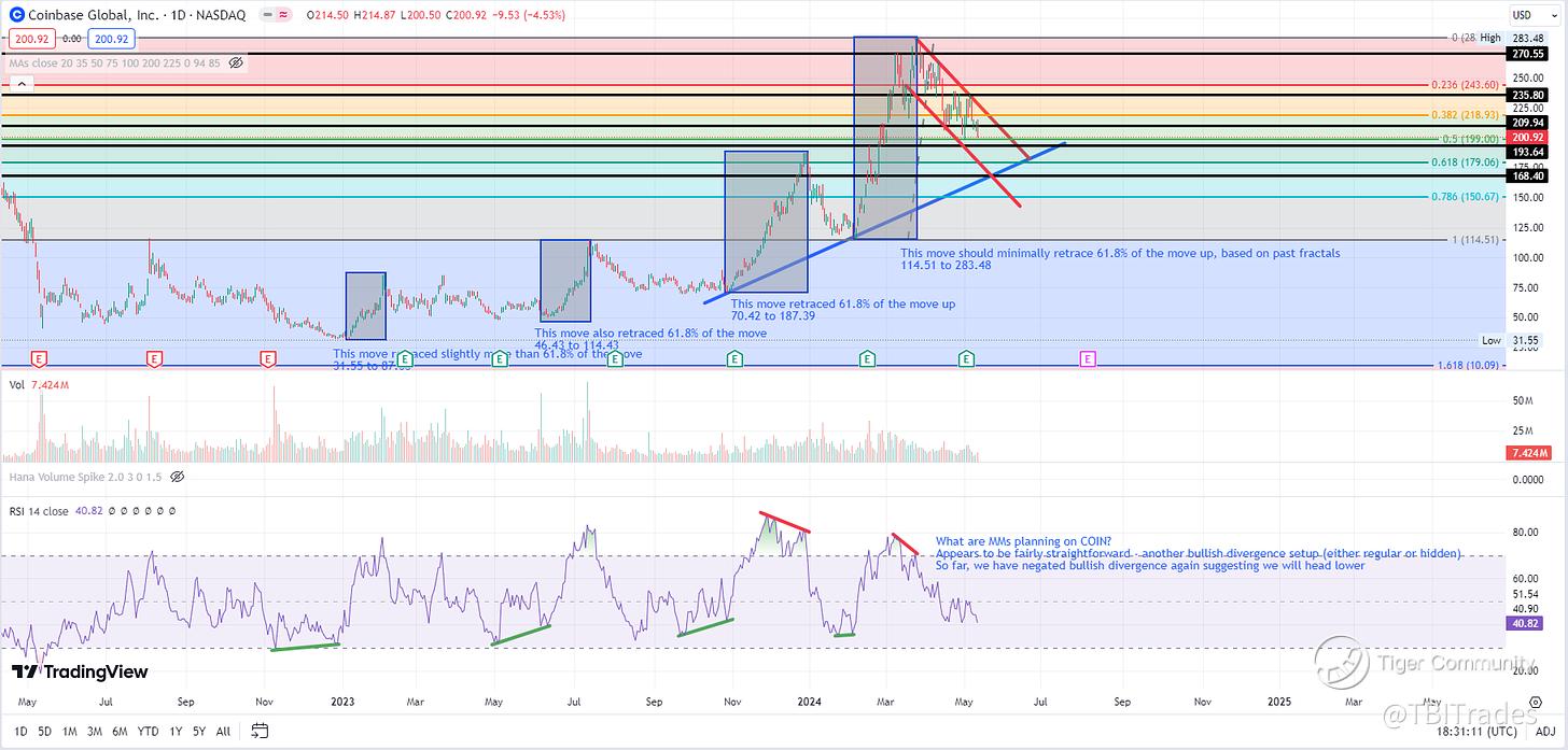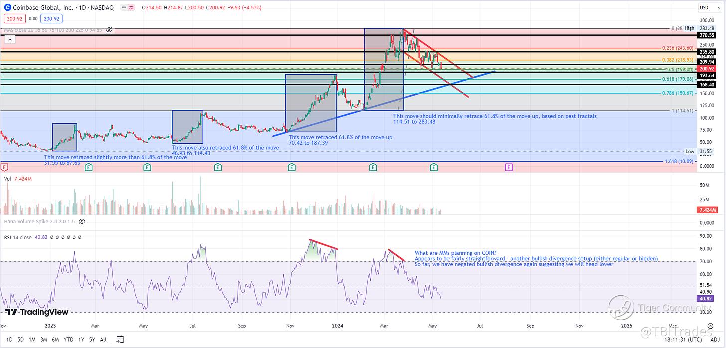 For me to turn bullish on COIN, I need to see signs of a bullish divergence. Notice how the past 4 rallies started only after we formed a regular bullish divergence on the daily chart. Until then, I continue to be bearish on COIN.