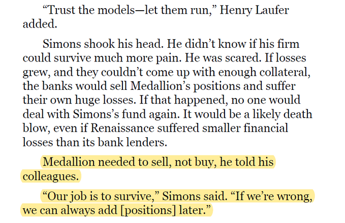 Jim Simons when overriding the model during the 2007 quant quake: “Our job is to survive. If we’re wrong we can always add [positions] later.” (Man Who Solved Market)