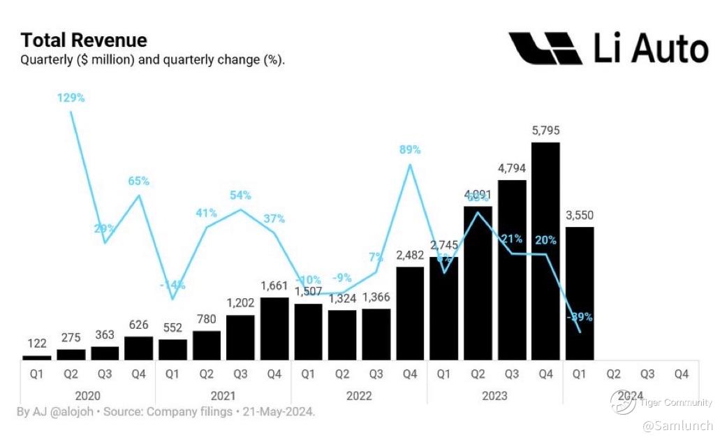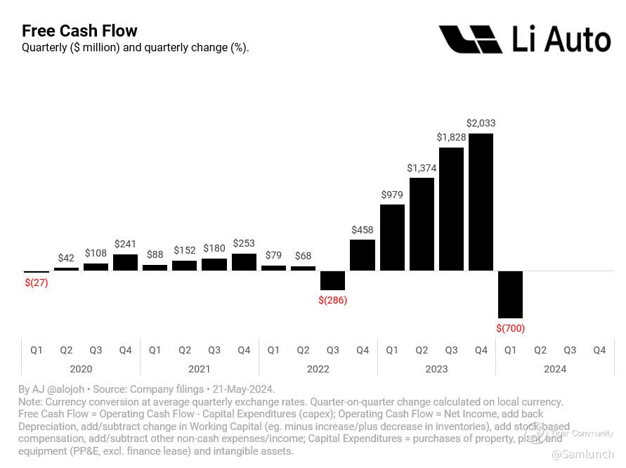 🔥BREAKING: Li Auto reported negative free cash flow of $700 million for Q1 2024 as revenue declined -39% quarter-on-quarter.