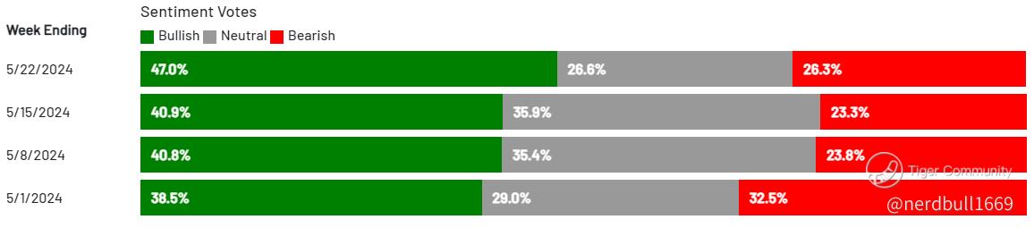 The AAII sentiment is a contrary indicator in the sense that highly bullish readings may suggest excessive complacency and a lack of fear in the market. Conversely, bearish readings are favorable for market upturns.