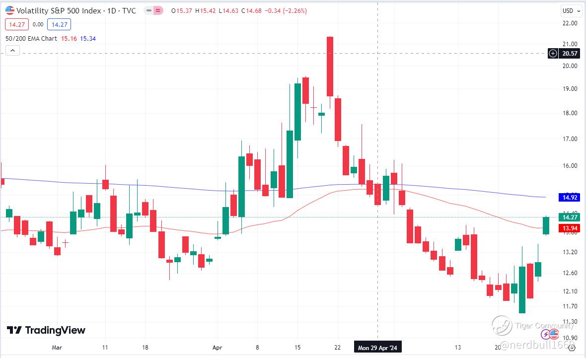 The $Cboe Volatility Index(VIX)$ also known as the fear gauge, is derived from option prices. In late March, it was trading around the 13 level. However, market volatility led to an increase in the VIX, and on April 19, it reached a local high of 21.4 (the highest since late October), signaling fear in the market.
