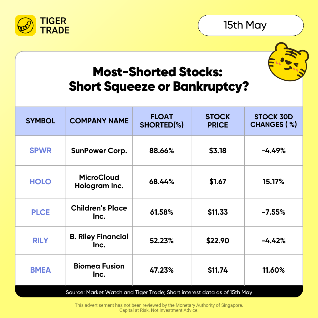 According to the latest short interest data (as of May 15), the top five most shorted stocks are $SunPower(SPWR)$ , $MicroCloud Hologram Inc.(HOLO)$ , $Children's Place(PLCE)$ , $B. Riley(RILY)$ , and $Biomea Fusion, Inc.(BMEA)$ .
