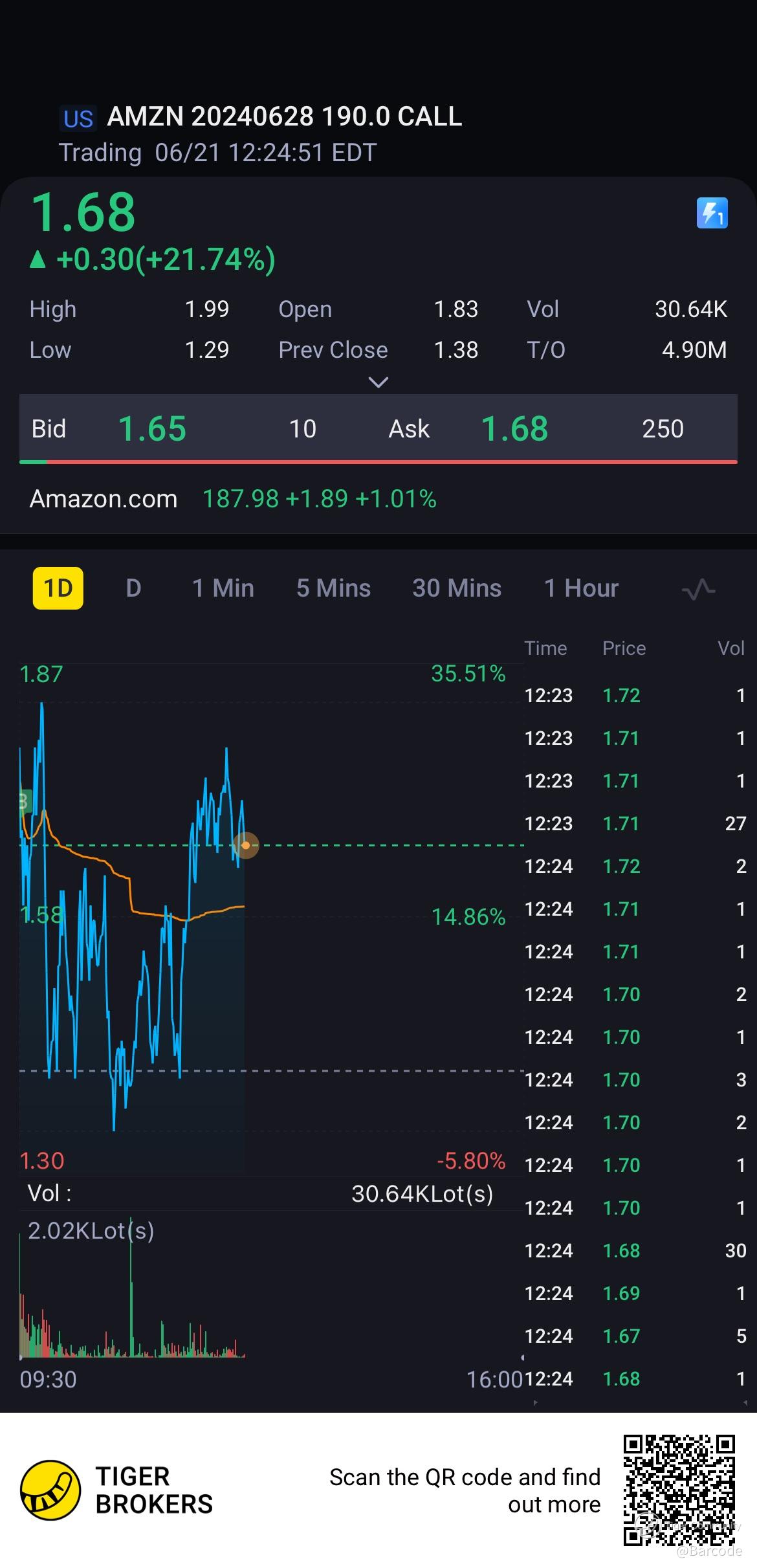 $AMZN 20240628 190.0 CALL$ Edging closer to my SP. Presently trading at $188.13. Come on Amazon let's see something amazing!