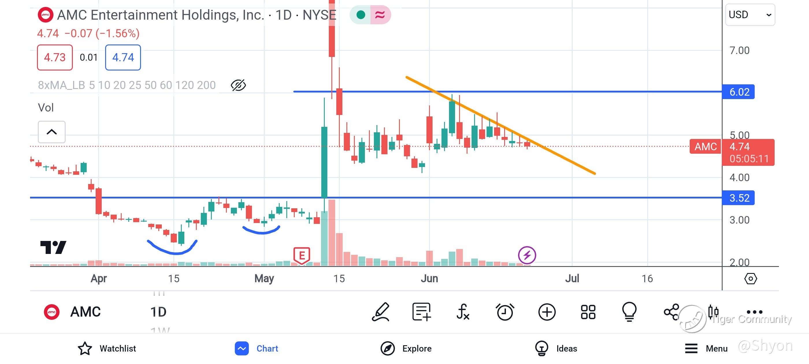 If we look at AMC chart from technical aspect, it seems like the stock starts to lose its momentum. Since early June, the share price was resisted by the orange coloured downtrend line. In addition, with the cool down of meme frenzy in the market, I think $AMC Entertainment(AMC)$