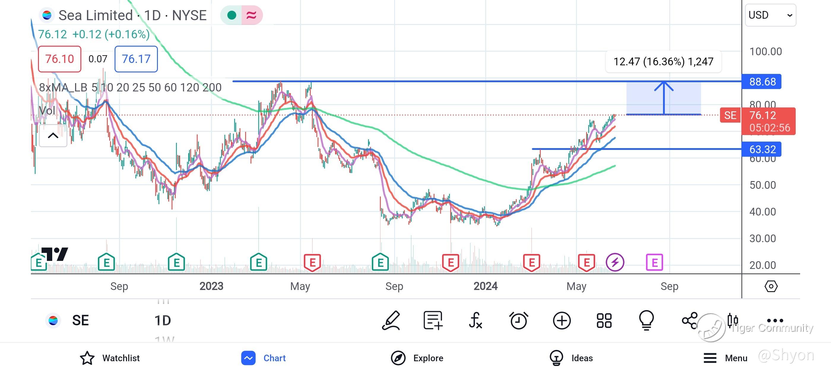 Another crazy week for SE, the stock price remains strong despite the pullback in US markets end of this week. For near to mid term, my first target price for SE will be at 88.68 USD, which is approximately 16% of gain from current price. How I set the 88.68? It's based on the previously double top resistants in May 2023. I believe $Sea Ltd(SE)$