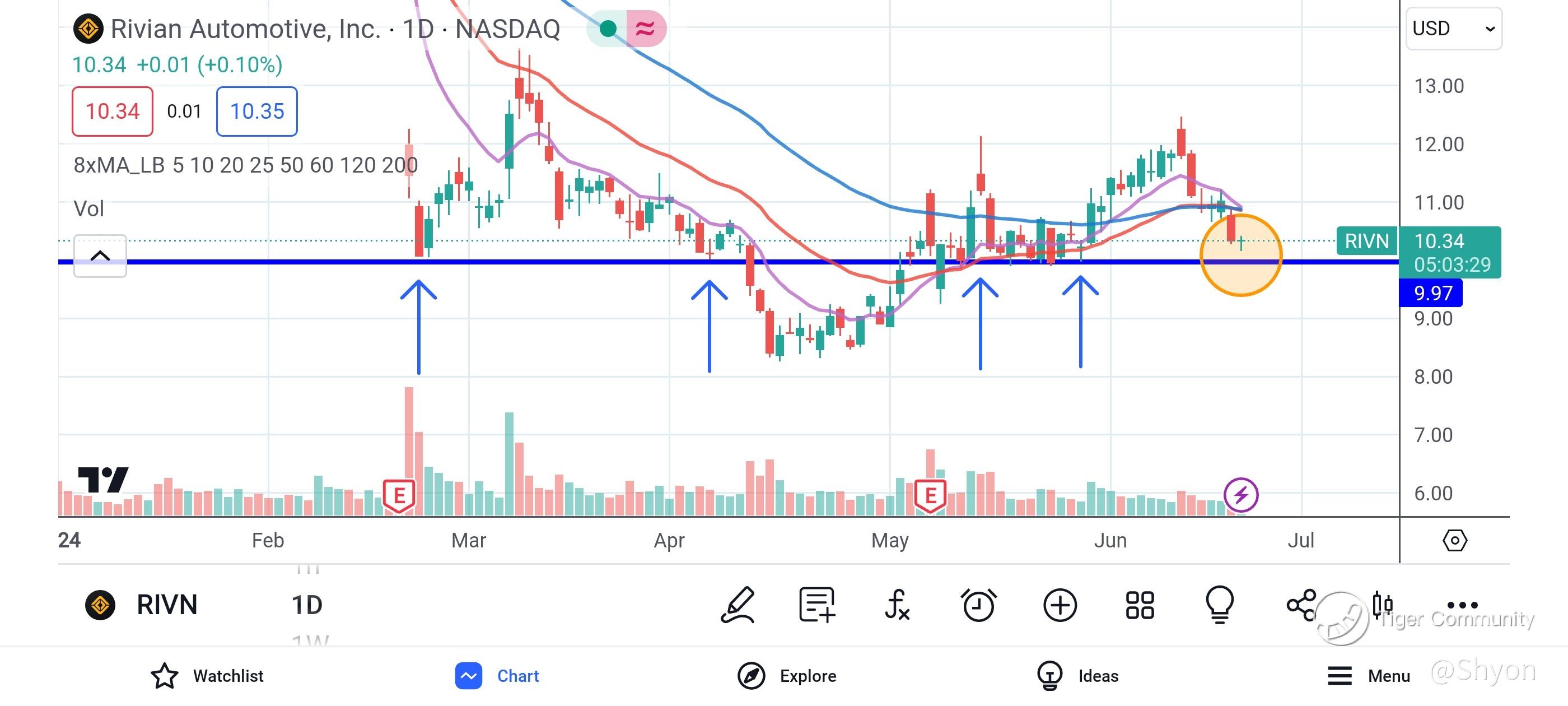 For Rivian, the share price underwent correction significantly last week. The nearest support will be around 10 USD, and this is a super strong neckline support as Rivian rebounds at least 4 times in 2024 once the share price touches this support. I believe history will repeat and similar thing will happen again. Since the current share price is very close to the support, the chance for $Rivian Automotive, Inc.(RIVN)$