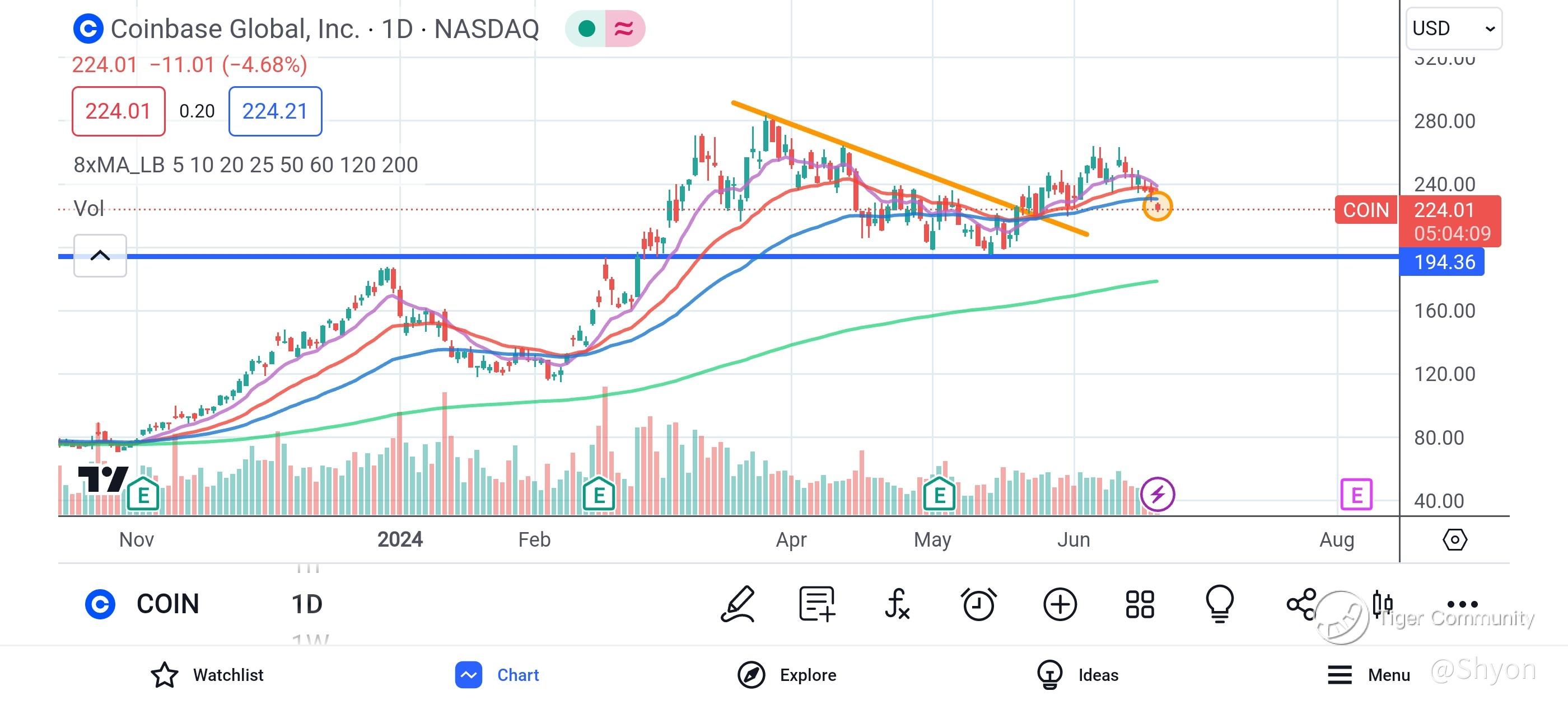 Another boring week for crypto! For COIN, the chart above showed an alert sign of further retracement as the share price broke below EMA50 trendline support last night. With this setup, I believe Coinbase will continue to pullback towards its neckline support drawn in BLUE line, at around 194.36 USD. A bearish vote for $Coinbase Global, Inc.(COIN)$