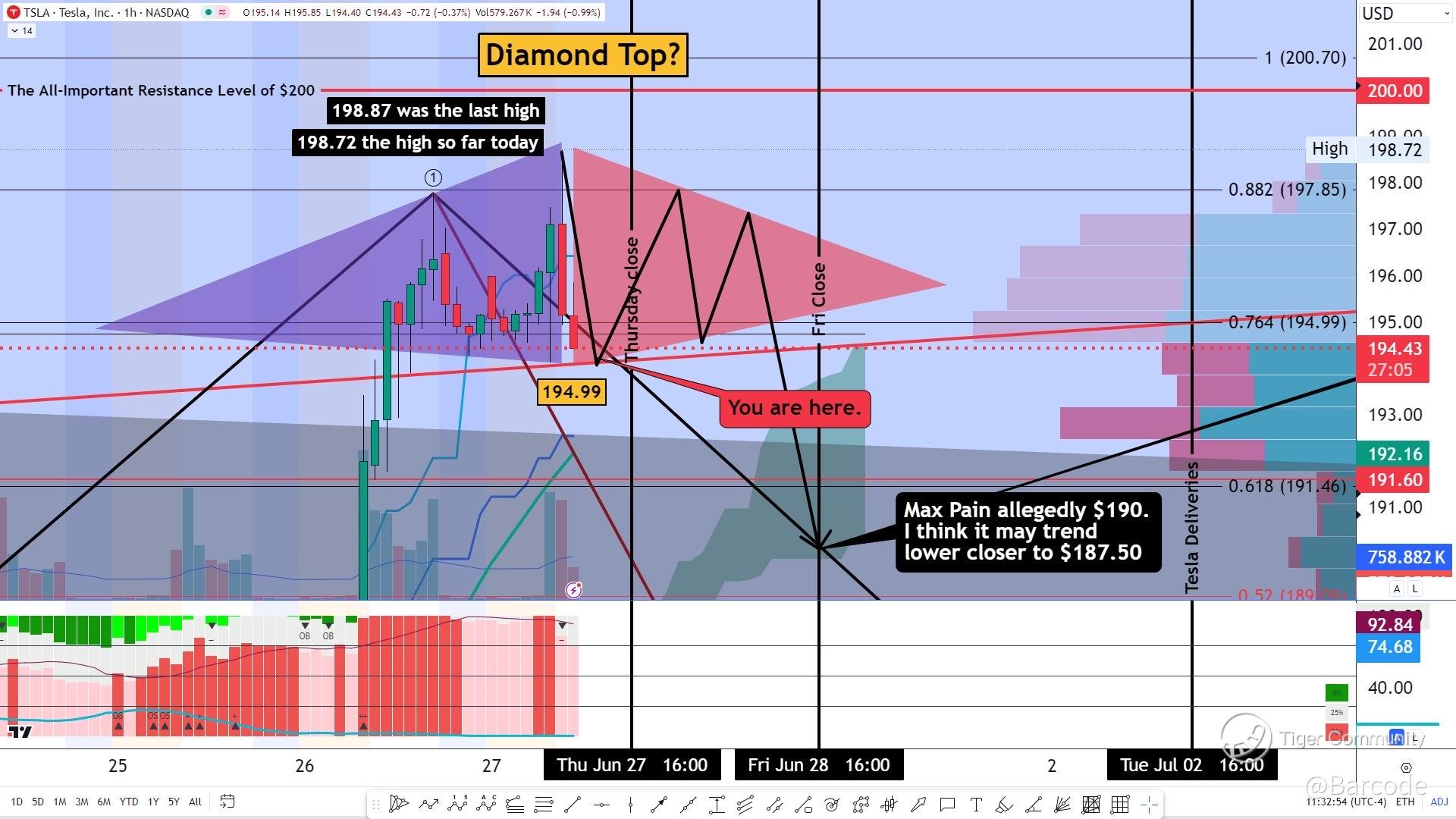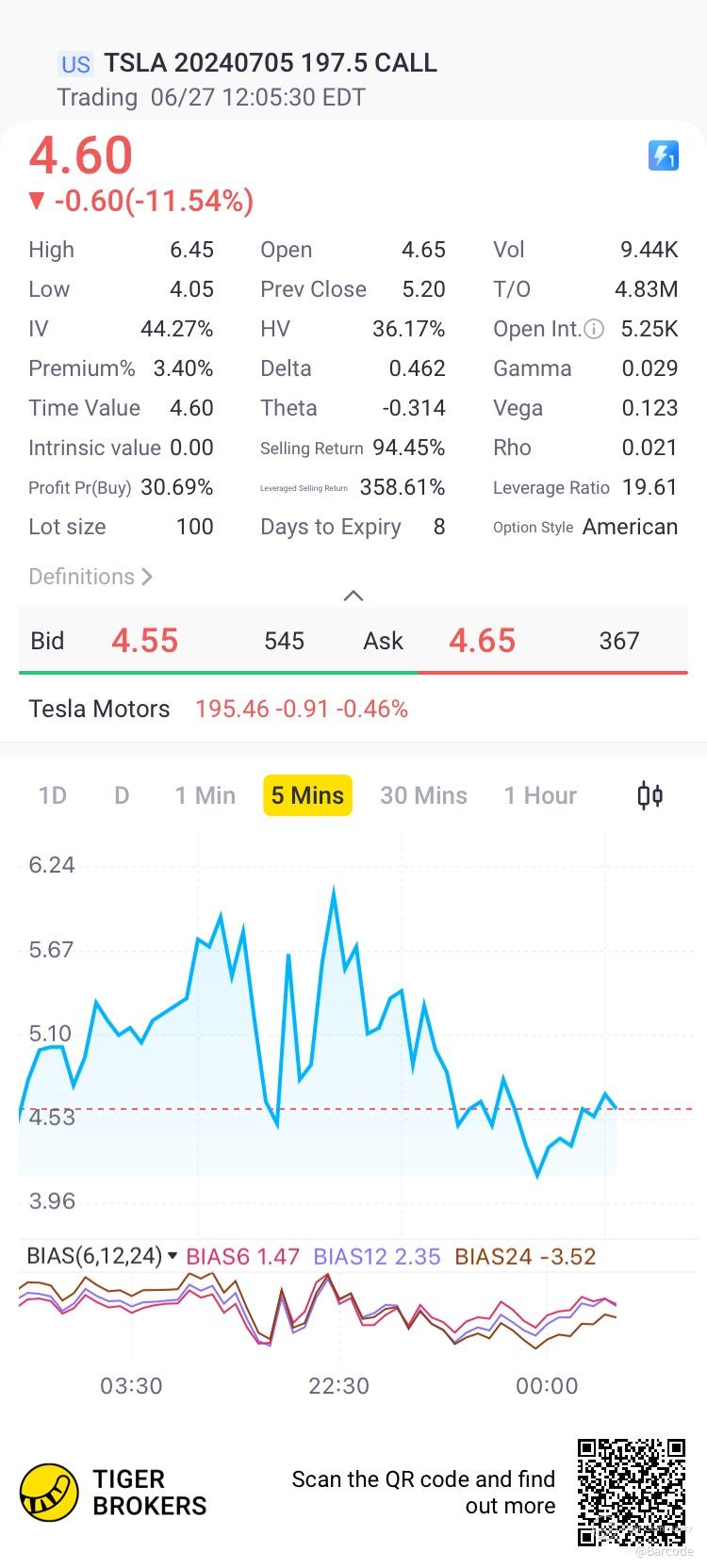 As for your next trade, it seems like you're considering a Call Option on $TSLA with a strike price of $197.5 and an expiration date of July 5, 2024. You mentioned a target price of $198 in the very short term.