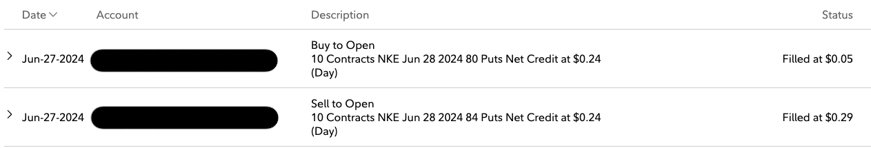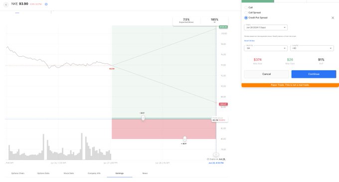 Took an optionselling pre-earnings trade on $Nike(NKE)$ . Sold-to-open the June 28 expiration 84/80 put credit spread. Might also take a trade on the call side ... tbd.
