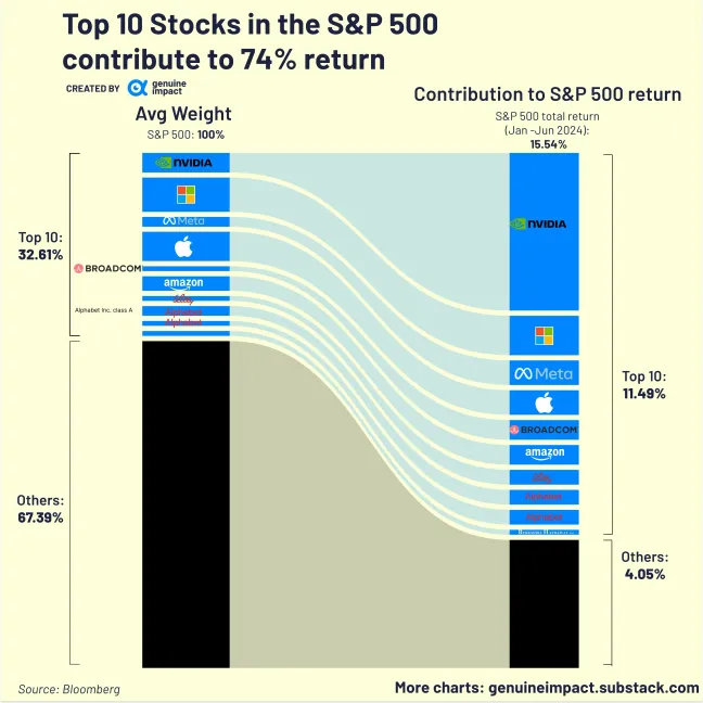 Top 10 stocks, esp. Magnificent 7, contribute the most gains in stock market.