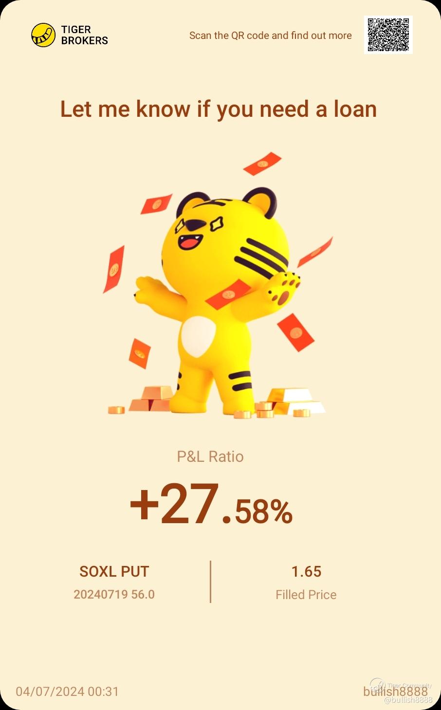$SOXL 20240719 56.0 PUT$ pocketing tips before holiday closure which might drive down hype