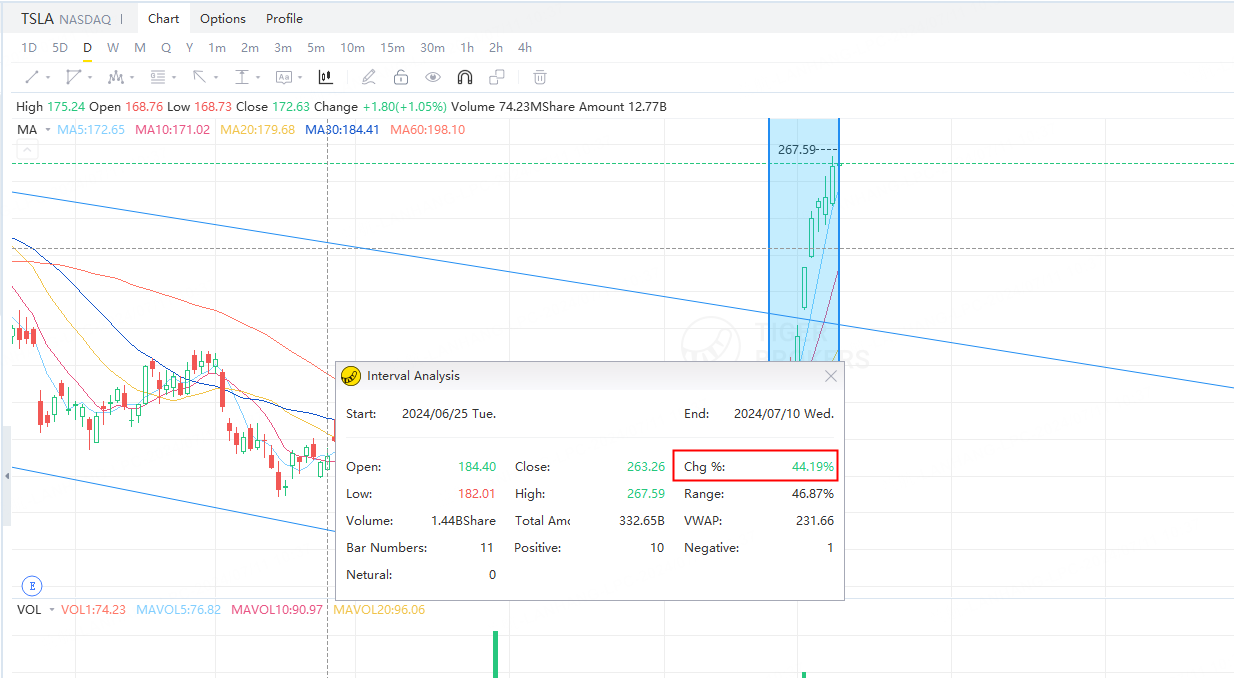 Recently, investors who went long on TESLA have reaped significant gains! Over the last 11 trading days, TESLA has continuously risen, with an impressive increase of 44.19%, marking the longest streak in nearly a year.