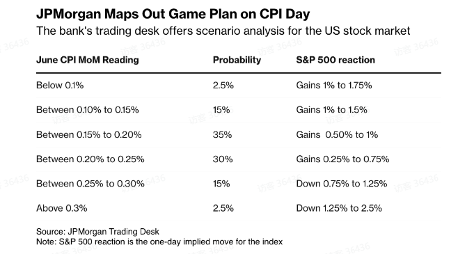 Scenario 2 | CPI rises 0.2%-0.25% MoM (30% probability) | J.P. Morgan believes that whether the figure is 0.2% or 0.25% will significantly impact the initial market reaction. A 0.25% figure could round up to 0.3%, likely eliciting a negative response, whereas 0.2% could be seen positively. In this scenario, the S&P 500 is expected to rise 0.25%-0.75%. |