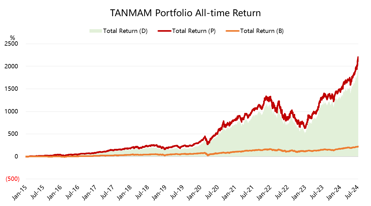 The Magnificent Seven form a portfolio (the "TANMAMG" portfolio) that is equally weighted and reweighted quarterly.The backtest results are a far outperformer of the S&P 500 since 2015, with a total return of 2115%, while the $SPDR S&P 500 ETF Trust(SPY)$ returned 220% over the same period, before pulling back after hitting record highs.