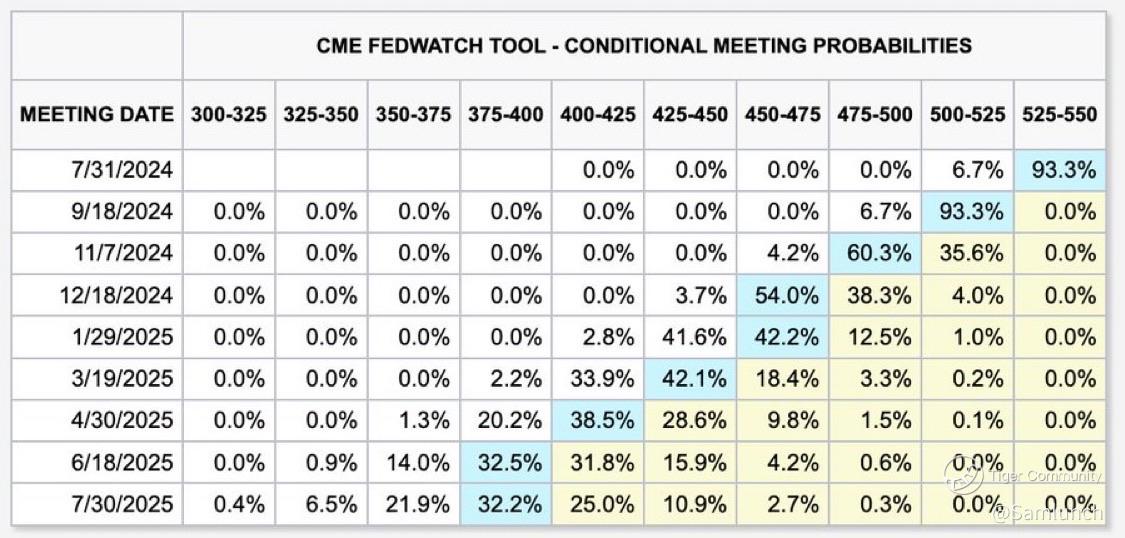 The base case shows rate cuts at every meeting remaining in 2024 starting in September.
