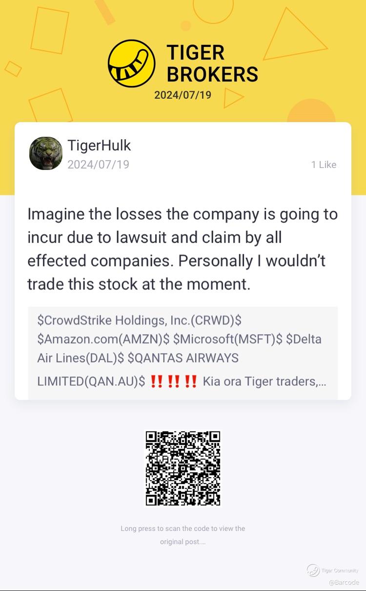 @TigerHulk Kia ora and thank you for reading my post and your valuable insights! You’ve hit the nail on the head regarding the fallout from this colossal IT outage. The disruption to critical services, including major banks, airlines, and tech giants, is staggering. The legal and financial repercussions for $CrowdStrike Holdings, Inc.(CRWD)$ CrowdStrike could indeed be monumental. I can almost see the lawyers now, gleefully rubbing their hands together at the thought of the impending litigation bonanza.