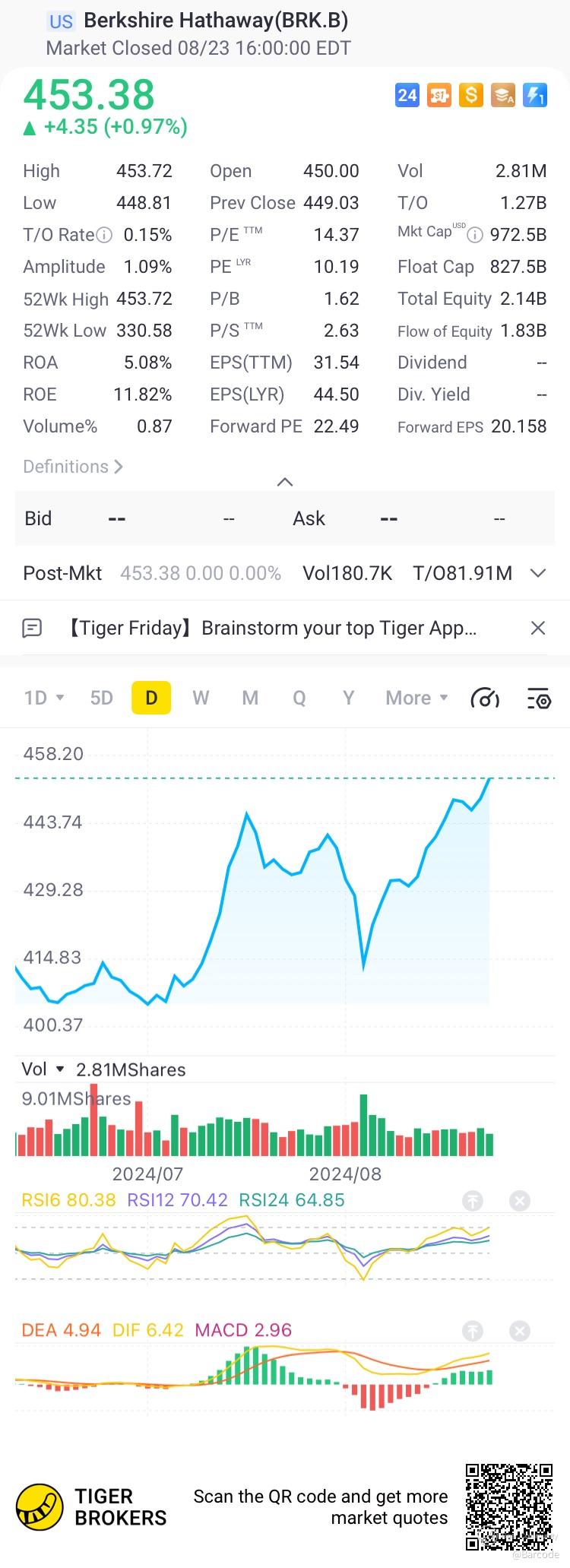 The current stock price of Berkshire Hathaway on August 25, 2024, is $453.38.