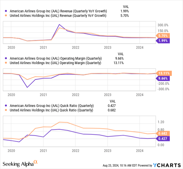 Comparing American Airlines and United, I think AAL is in a worse position. Its annual revenue growth and operating margins are lower, which have seen declining profitability since 2023. American Airlines also has a lower quick ratio of ~0.43X compared to United At ~0.68X, indicating a weaker liquidity position. See below: