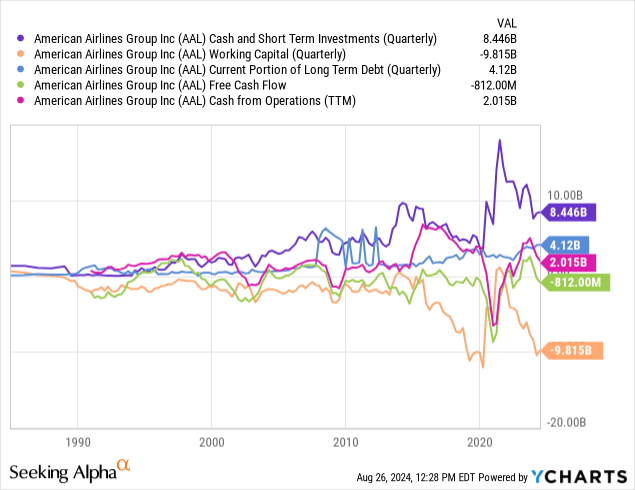 Most of this debt is based on rolling maturity loans due over the coming years. The company has managed to extend some of these loans. S&P Global previously said it expected debt reductions from higher free cash flow in 2024, but the opposite may be true, as its cash flow has turned in an explicit negative direction since then. With this in mind, I believe there is a material risk that American Airlines will see either a credit downgrade or a negative outlook, potentially raising its interest rates and costs, making a consistently positive net income less tenable.