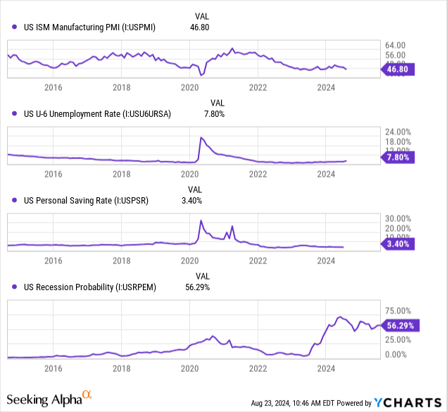 While we cannot predict a recession with absolute certainty, the economic leading indicators give a relatively clear signal today. The manufacturing PMI failed to recover above 50 and shifted in a negative direction, indicating accelerating declines in US manufacturing activity. Although not clear in the chart, unemployment and underemployment (measured in "U-6") are now rising at a considerable pace, triggering the "Sahm Rule" recession signal. The odds of a recession based on changes in interest rates, notably the steepening after prolonged curve inversion, place the Estrella-model recession odds at over 50%. Finally, personal savings levels are declining, indicating that many households lack discretionary spending capacity. See below:
