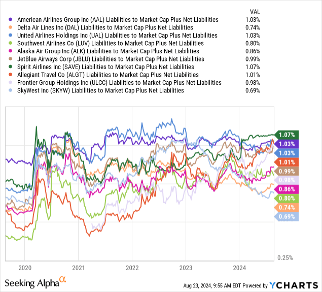 American Airlines is likely one of the least solvent US airlines today. The worst is undoubtedly Spirit Airlines (SAVE), which, based on its stock price, I believe appears likely to face bankruptcy soon. However, American Airlines' liabilities-to-market cap plus net liabilities are nearly as bad. This figure represents a company's total liabilities to its Enterprise Value (or a similar figure). Suppose it's near or close to one; that tells us that the market may be pricing its liquidation value at or near zero. See how the airlines stack up below:
