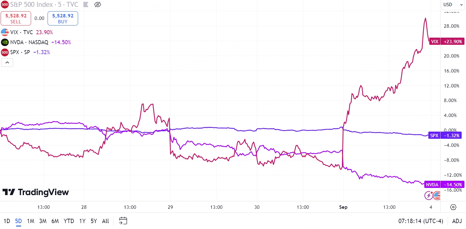 The $Cboe Volatility Index(VIX)$ jumped due to a tech stock sell-off dragging down the $S&P 500(.SPX)$ . $NVIDIA Corp(NVDA)$ gapped down 2.8% and continued to slide, ending 9.5% lower at a three-week low of $108, shrinking its market cap by $279 billion.