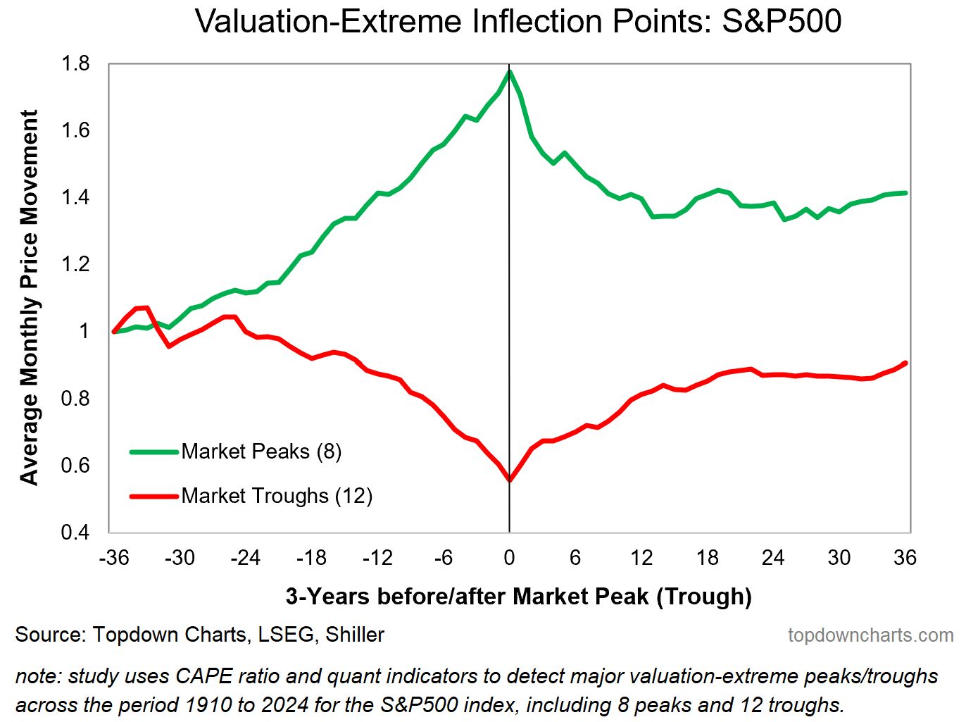 4. How the Data Tracks: I ran the numbers for the US stockmarket and here’s what the each end of the cycle looks like for traditional valuation-extreme peaks/troughs. One point of interest is the frequency (8 peaks, 12 troughs over a 114-year period) — valuation extreme driven market peaks and troughs are relatively rare …but can of course be major opportunities to add value by either maximizing upside capture (from troughs) and/or protecting capital (from peaks). The other interesting aspect is the shape… it’s not a smooth slow moving gentle transition, it’s more often a sharp climax and sudden reversal.