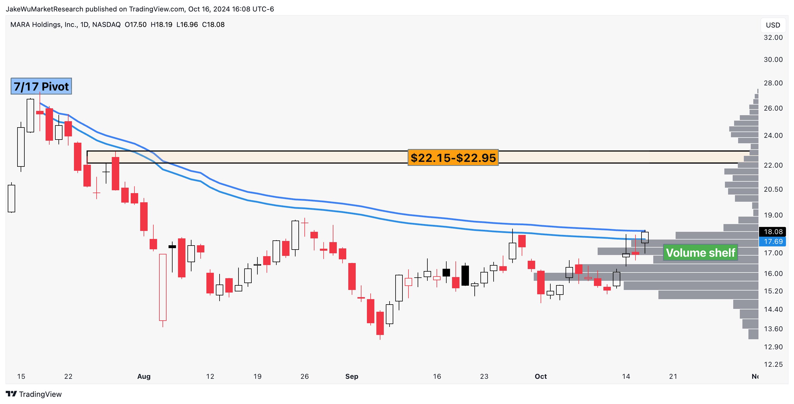 For $Marathon Digital Holdings Inc(MARA)$ , the current price is $18. The chart from Jake Wujastyk, a well-known technical analyst on the X platform, gives me the information that after reaching $17.69, there are not many locked-in shares above, and it feels easy to break through. Is the interim target price above $22?